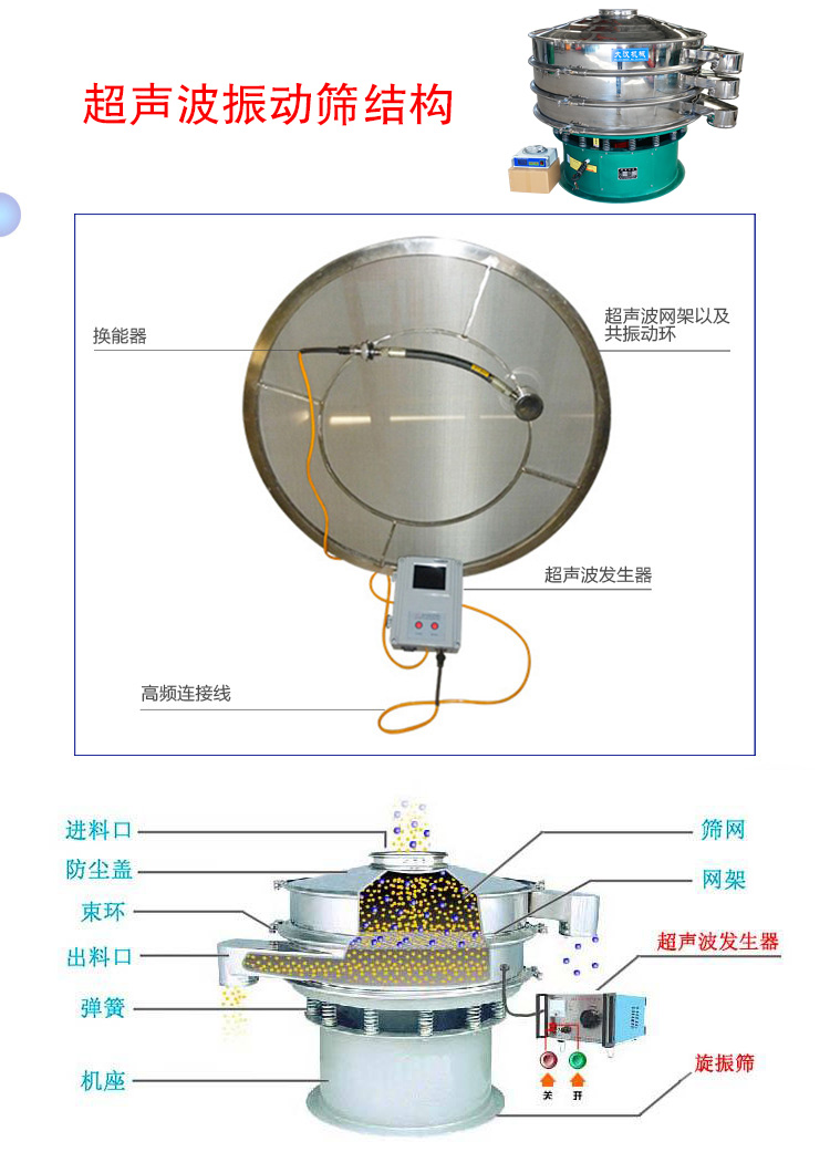 超聲波振動(dòng)篩是將220v、50HZ或110v、60HZ電能轉(zhuǎn)化為38KHZ的高頻電能,輸入超聲換能器,將其變成38KHZ機(jī)械振動(dòng),從而達(dá)到篩分和清網(wǎng)的目的。