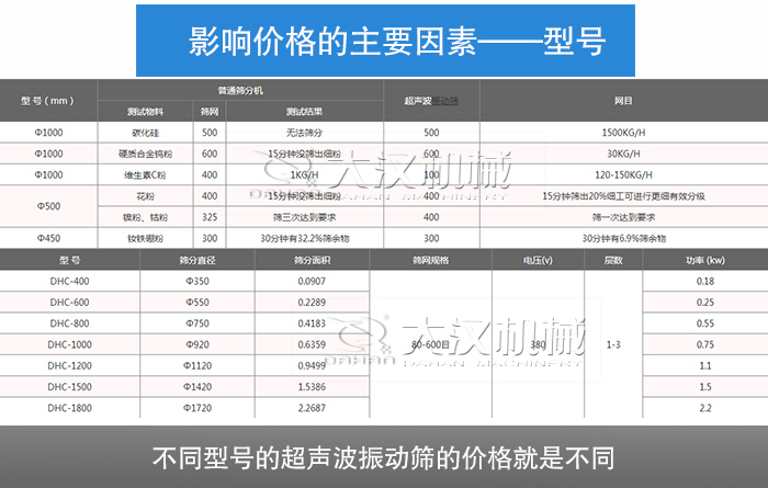 超聲波振動篩型號有:DHC-400、DHC-600、DHC-800、DHC-1000、DHC-1200、DHC-1500、DHC-1800、DHC-2000等八種標(biāo)準(zhǔn)直徑型號;不同型號的超聲波振動篩的價格就是不同,其中影響型號的的因素有:篩網(wǎng)(1—5層)、材質(zhì)(不銹鋼、碳鋼)、振動電機(功率不同)等。