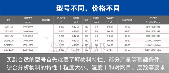 想要購買到合適的型號首先就要了解物料特性、篩分產(chǎn)量等基礎(chǔ)條件,綜合分析物料的特性(粒度大小、濕度)和對網(wǎng)目、層數(shù)等要求。要綜合考慮材質(zhì)、生產(chǎn)場地等條件。同時(shí)我們公司可以根據(jù)您的產(chǎn)量等要求為您推薦型號(DZSF-515、DZSF-520、DZSF-530、DZSF-1020、DZSF-1030、DZSF-1540等),同時(shí)大漢公司還支持設(shè)備特殊定做,為您定制專屬的篩分設(shè)備。