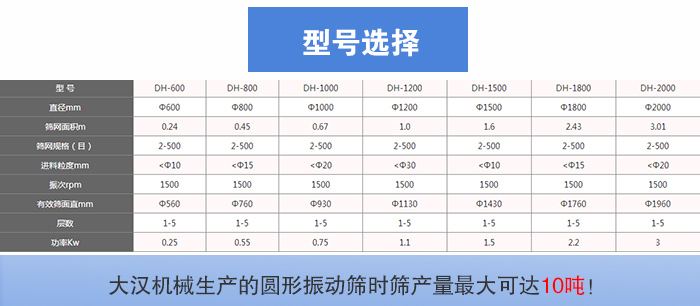 大漢機(jī)械生產(chǎn)的圓形振動(dòng)篩時(shí)篩產(chǎn)量可達(dá)10噸!型號有:DH-400mm、DH-600mm、DH-800mm、DH-1000mm、DH-1200mm、DH-1500mm、DH-1800mm、DH-2000mm等八種標(biāo)準(zhǔn)型號。可滿足肥料每小時(shí)500KG—10T的大、中、小產(chǎn)量的篩分工作。
