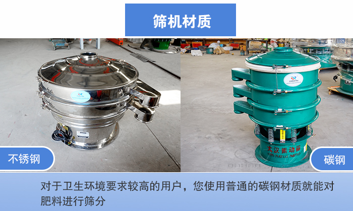 肥料篩分可用的圓形振動(dòng)篩有兩種材質(zhì):碳鋼、不銹鋼;碳鋼材質(zhì)的圓形振動(dòng)篩熱處理和機(jī)械性能好,價(jià)格便宜,但是長時(shí)間的使用會(huì)發(fā)生腐蝕、生銹等問題,不適合用于對衛(wèi)生行業(yè)要就較高的物料和企業(yè);而不銹鋼材質(zhì)耐酸耐堿、防腐防銹、衛(wèi)生環(huán)保,廣泛用于化工、食品、醫(yī)藥等行業(yè)。所以如果不是對于衛(wèi)生環(huán)境要求較高的用戶,您使用普通的碳鋼材質(zhì)就能對肥料進(jìn)行篩分。