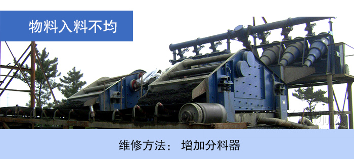 進入圓振篩的下料漏斗,是一個人字型的漏斗,而入料皮帶時常跑偏和漏斗積泥等原因,導致分料不均,從而致使一邊篩網(wǎng)嚴重過載,而另一邊篩網(wǎng)近乎空載運行,所以常造成篩網(wǎng)磨損不均破損較快。