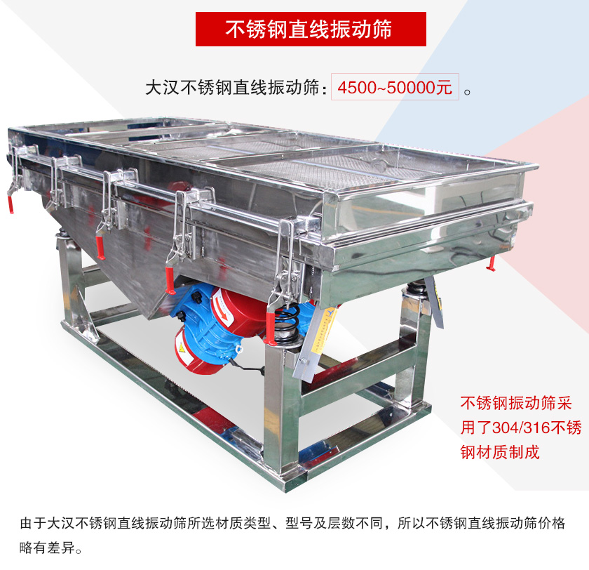 不銹鋼振動篩采用了304/316不銹鋼材質制成的,設備經(jīng)由拋光處理,可以用于食品、醫(yī)藥等對衛(wèi)生要求較為嚴格的行業(yè),那么不銹鋼直線振動篩多少錢一臺呢?大漢小編這就來為您進行介紹。