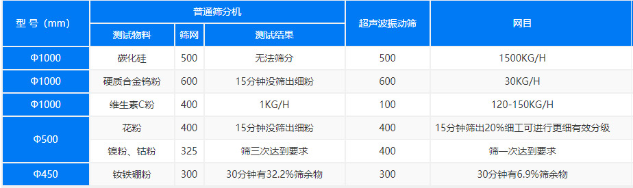 超聲波振動篩的常規(guī)型號有直徑600mm、直徑800mm、直徑1000mm、直徑1200mm、直徑1500mm等。不同種直徑的旋振篩篩分的物料量、目數(shù)也不同。舉個例子,直徑600型超聲波振動篩測試物料花粉,篩網(wǎng)目數(shù)400目,15分鐘篩出20%的細粉,并可以進行更細有效分級。
