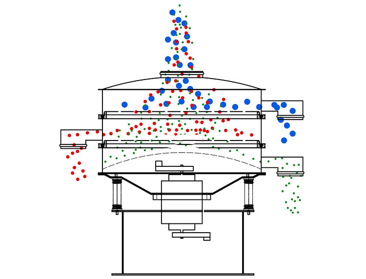 辣椒醬篩分機(jī)工作時(shí),辣椒醬從進(jìn)料口投入篩面,通過(guò)立式電機(jī)產(chǎn)生的振動(dòng)力,使辣椒醬在篩面上快速向四周擴(kuò)散,小于篩網(wǎng)孔徑的辣椒醬直接透網(wǎng),從下層出料口出料,被攔截在篩面上的大顆粒就沿著當(dāng)前篩面的出料口排出。